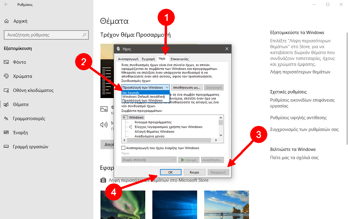 Από το μενού με τις ενότητες στα αριστερά επέλεξε την επιλογή Θέματα. Λίγο πιο κάτω κάνε κλικ στην επιλογή Ήχοι.