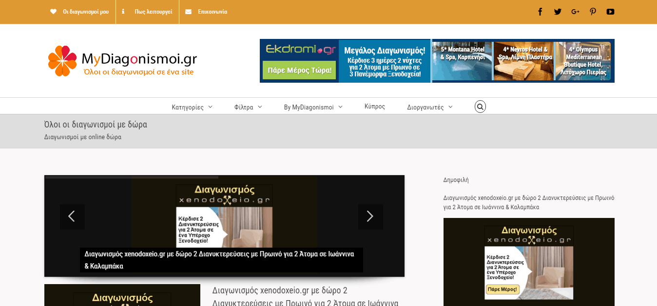 Το diagonismos.gr ανανεώνεται κι αυτό σχεδόν σε καθημερινή βάση με νέους διαγωνισμούς, δίνοντας σου την επιλογή να επισκεφτείς την σελίδα του διαγωνισμού ώστε να πάρεις μέρος.