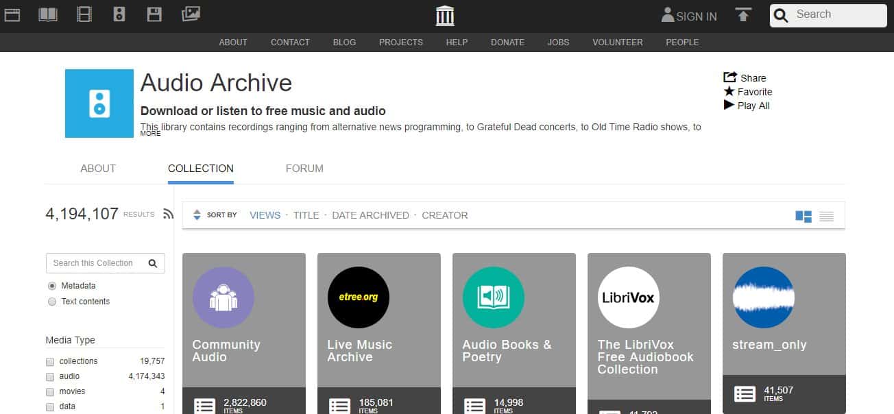Το Audio Archive είναι μια εξαιρετική ιστοσελίδα με μια μεγάλη γκάμα κομματιών που περιλαμβάνει καινούργια και παλιά δωρεάν κομμάτια, τα οποία έχει ανεβάσει η ίδια η κοινότητα. Τα περισσότερα κομμάτια είναι διαθέσιμα σε διαφορετικές μορφές, συμπεριλαμβανομένων MP3, OGG, M3U και πάει λέγοντας, ενώ όλα είναι υψηλής ποιότητας.