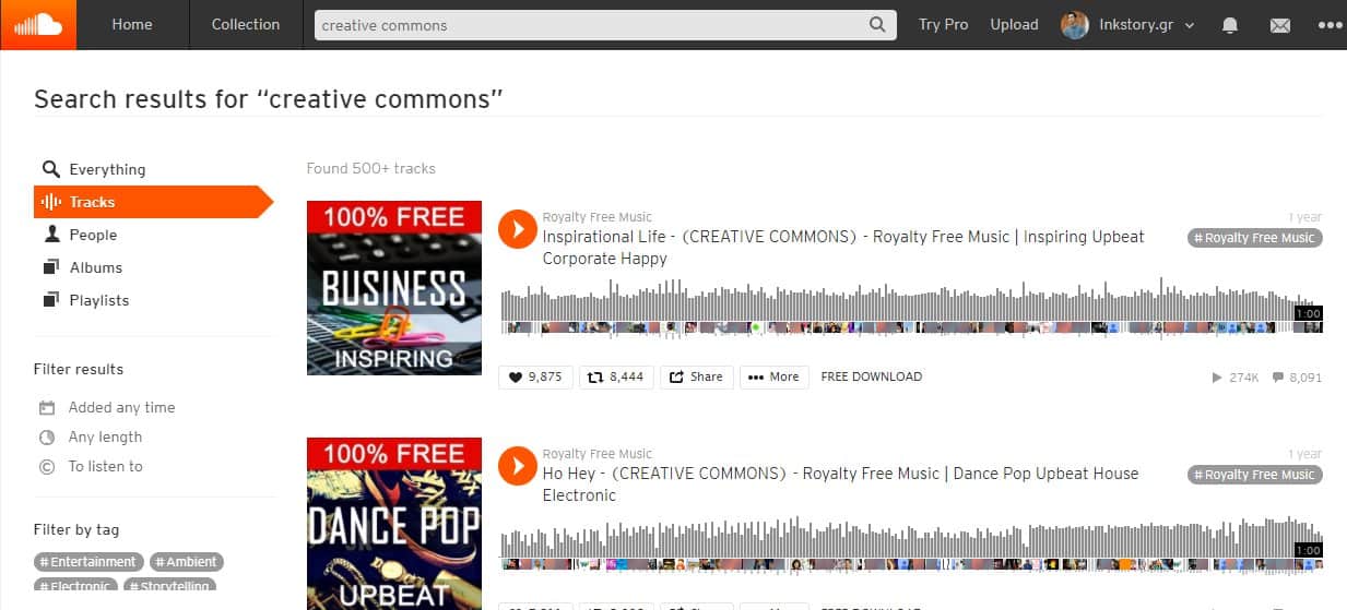 Το SoundCloud είναι μια από τις πιο γνωστές ιστοσελίδες σε ολόκληρο τον κόσμο. Μπορεί τα περισσότερα κομμάτια που ακούς στην υπηρεσία να μην παρέχονται δωρεάν, αλλά θα βρεις εκατοντάδες τα οποία είναι διαθέσιμα υπό την άδεια CC-Licensed. Αυτά τα κομμάτια μπορείς να τα αναζητήσεις από την ενότητα Royaly Free Music.