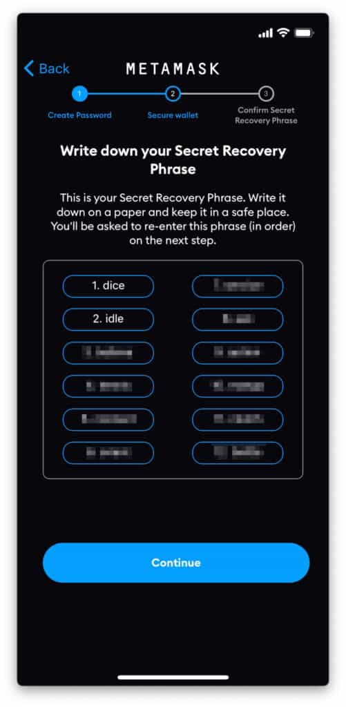 Θα σου εμφανίσει 12 λέξεις σε κάποια κουτάκια . Οι λέξεις αυτές είναι ουσιαστικά τα Secret Recovery Phrases. Είναι μοναδικά για κάθε χρήστη του πορτοφολιού. Γραψ’ τα σε ένα χαρτί και πάτα “Continue”.