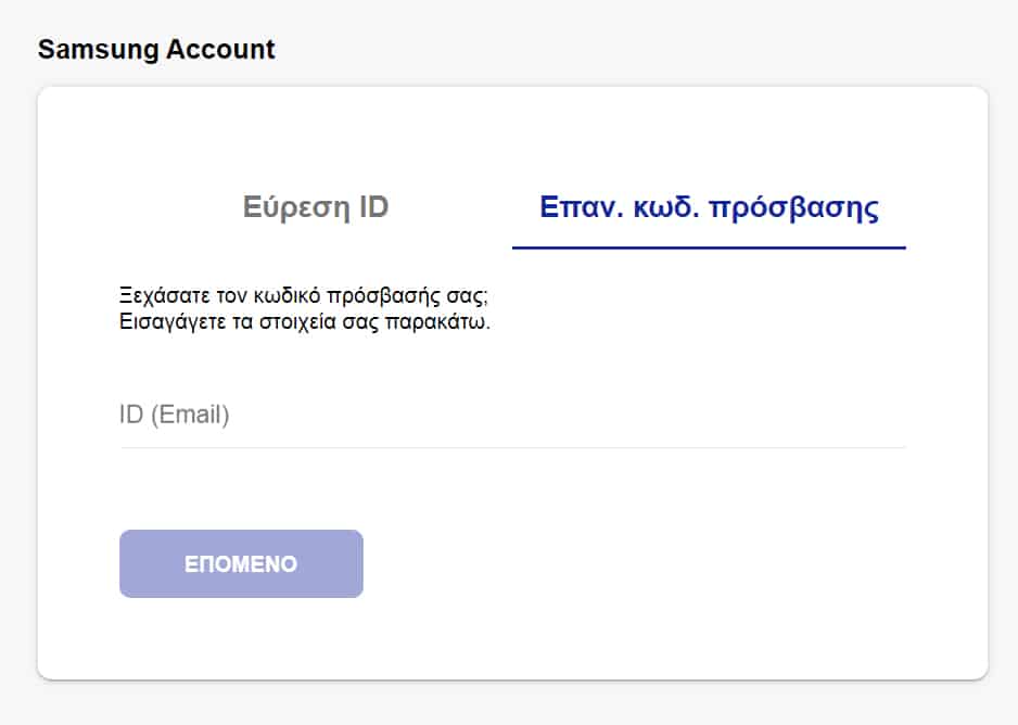 Βήμα 1: Πρώτον, πρέπει να κάνεις κλικ στο “Find ID and Reset password?/ Αναγνωριστικό προσώπου και Επαναφορά κωδικού πρόσβασης;” Ο σύνδεσμος προέρχεται από το πεδίο σύνδεσης στην ιστοσελίδα του λογαριασμού της Samsung.