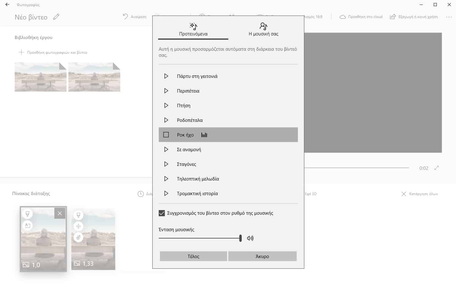 Αν το Microsoft Photos δεν παρείχε τη δυνατότητα να προσθέσεις την δική σου μουσική, δεν θα ‘ταν και σωστή εναλλακτική του Windows Movie Maker. Κάνε λοιπόν κλικ στην καρτέλα ‘Μουσική‘ και επέλεξε ένα κομμάτι για τα βίντεο σου. Η εφαρμογή θα το συγχρονίσει σωστά αυτόματα. Μπορείς να επιλέξεις ένα από τα ήδη υπάρχον κομμάτια που παρέχει η εφαρμογή, ή ένα από τον υπολογιστή σου – αλλά δώσε μεγάλη προσοχή στην μουσική που βάζεις, καθώς θα πρέπει να έχεις τα πνευματικά δικαιώματα αν το δημοσιεύσεις online.