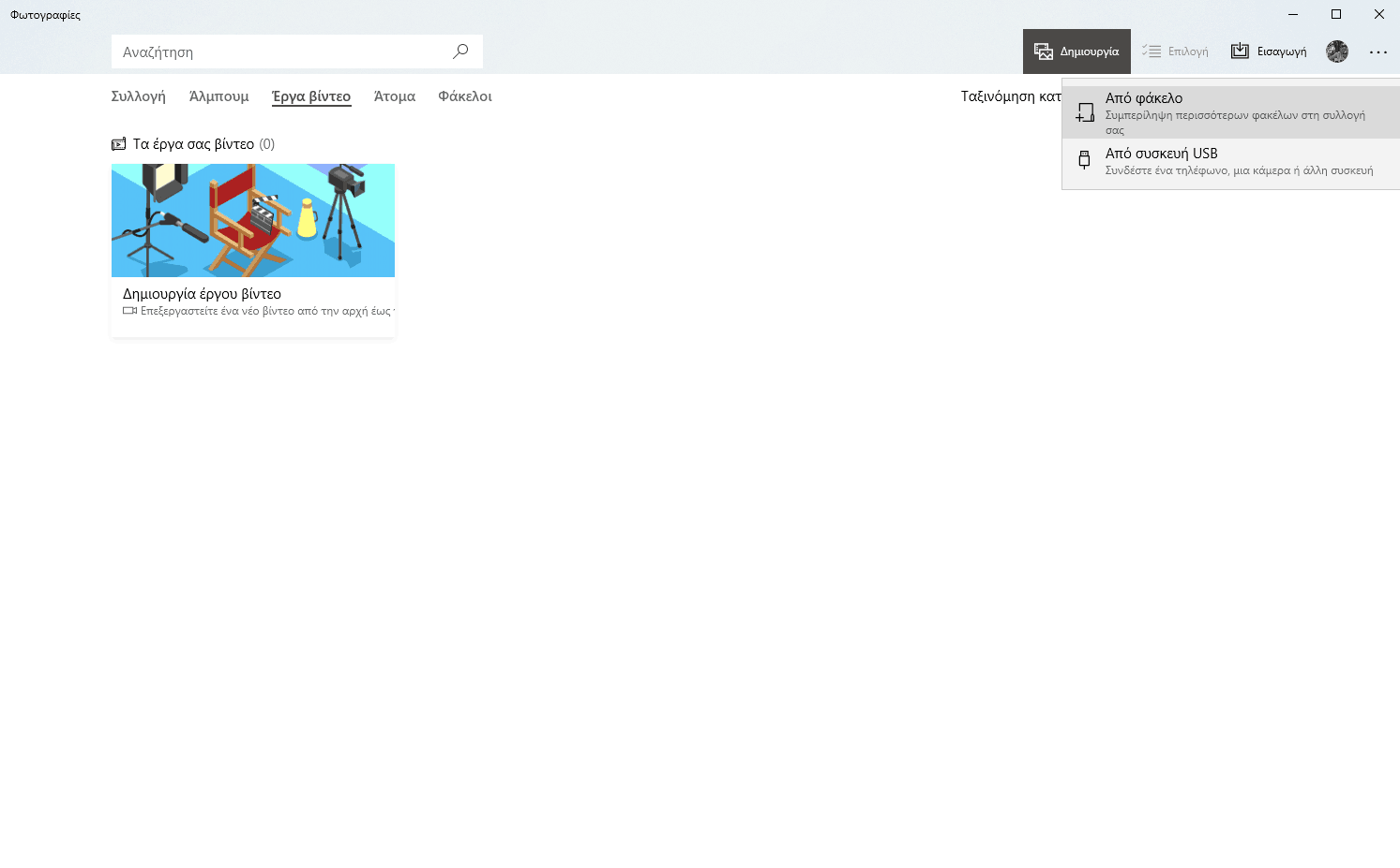 Για να προσθέσεις φωτογραφίες και βίντεο στην Photos εφαρμογή, επέλεξε το ‘Εισαγωή‘ κουμπί (βρίσκεται στην δεξιά πάνω γωνία) και στη συνέχεια κάνε κλικ στην επιλογή ‘Από φάκελο‘ ή στην επιλογή ‘Από συσκευή USB‘.