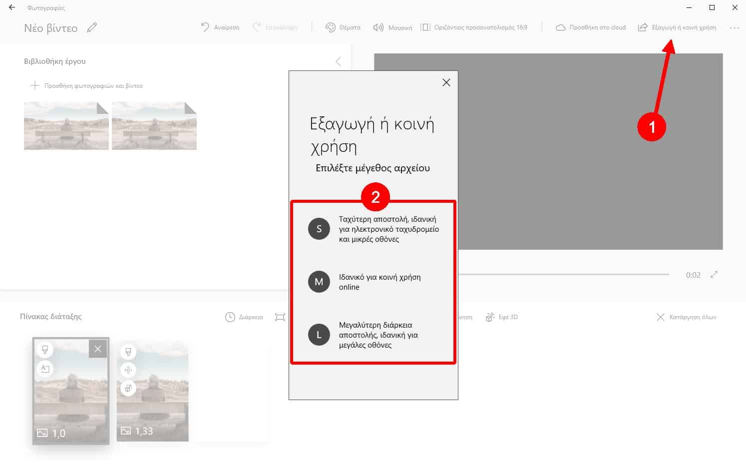 Μόλις είσαι ευχαριστημένος με το τελικό αποτέλεσμα του βίντεο, απλά επέλεξε την επιλογή ‘Εξαγωγή ή κοινή χρήση‘ από το επάνω μενού, επέλεξε μια επιλογή για το μέγεθος (μικρό, μεσαίο ή μεγάλο), επέλεξε την ποιότητα που θέλεις να έχει και την ανάλυση και το frame rate και το βίντεο θα ξεκινήσει να αποθηκεύεται σε MP4 μορφή. Τα βίντεο που αποθηκεύεις θα αποθηκεύονται αυτόματα στον φάκελο ‘Φωτογραφίες’ των Windows.