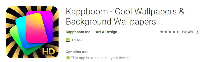Το Kappboom, το οποίο δεν προϋποθέτει να κάνεις λογαριασμό, σου προσφέρει μία τεράστια ποικιλία με πάνω από 200.000 φωτογραφίες. Επίσης, διαθέτει κατηγορίες και υποκατηγορίες, όπως αμάξια, κινούμενα σχέδια, ταινίες κλπ που σε βοηθούν να καταλήξεις στο φόντο που ταιριάζει στα γούστα σου. Παράλληλα μπορείς να χρησιμοποιήσεις και τις τρισδιάστατες φωτογραφίες που διαθέτει.