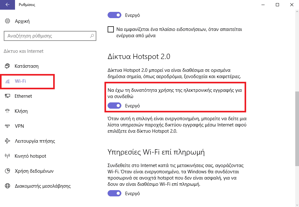 Εφόσον η συσκευή σου υποστηρίζει το Hotspot 2.0, έμεινε μόνο να το ενεργοποιήσεις. Η διαδικασία είναι πάρα πολύ απλή και εύκολη και ολοκληρώνεται μέσα από τις ρυθμίσεις των Windows 10.