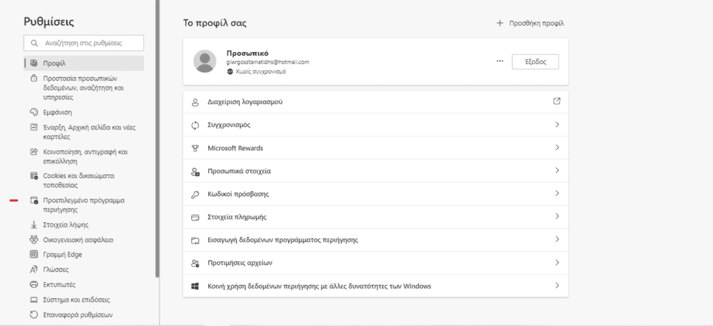 2. Στο νέο παράθυρο, πήγαινε στα αριστερά και κάνε κλικ εκεί που γράφει “Προεπιλεγμένο Πρόγραμμα Περιήγησης”.