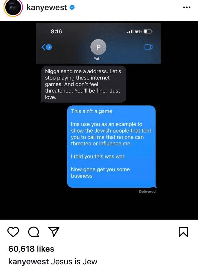 Ωστόσο, αυτός δεν ήταν ο λόγος για τον οποίο αποκλείστηκε από τις δημοφιλείς πλατφόρμες. Συγκεκριμένα, από το Instagram αποκλείστηκε λόγω του ότι έφερε στη δημοσιότητα κάποια από τα μηνύματα που αντάλλαξε με τον ράπερ Diddy στα οποία φαίνεται να υπαινίσσεται ότι χαλιναγωγείται από τους Εβραίους.