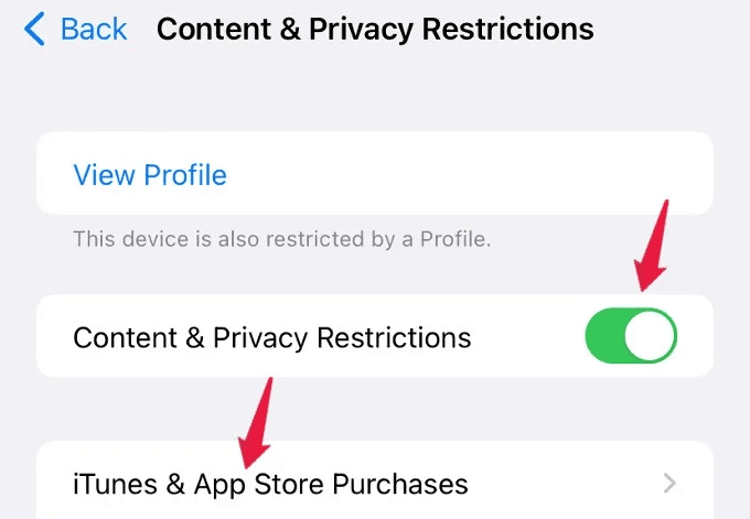 4. Στην επόμενη οθόνη πρέπει να ενεργοποιήσεις τον διακόπτη στην επιλογή Content & Privacy Restrictions (μπορεί να είναι ενεργοποιημένος από προεπιλογή). Αφού το κάνεις, πάτα από κάτω στην επιλογή iTunes & App Store Purchases.