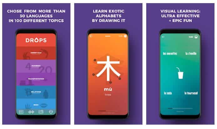Το Drops δεν θα μπορούσε να λείπει από τη λίστα των καλύτερων δωρεάν εφαρμογών εκμάθησης ξένων γλωσσών. Παρέχει περισσότερες από 20 γλώσσες και διαθέτει τρία διαφορετικά επίπεδα εκμάθησης, Beginner, Intermediate, και Advanced. Σύμφωνα με πληροφορίες διαθέτει επίσης το πιο διαδραστικό περιβάλλον εργασίας για τους χρήστες και μοναδικό τρόπο εκμάθησης των ξένων γλωσσών. Το Drops σας επιτρέπει επίσης να αποφασίσετε την ώρα που θέλετε να αφιερώσετε στο μάθημα εκμάθησης γλωσσών και σας επιβραβεύει αν δεν χάσετε μαθήματα και παρακολουθείτε καθημερινά.