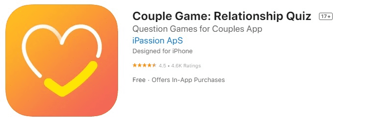Το Couple Game είναι μία εφαρμογή που σου δίνει τη δυνατότητα να βελτιώσεις τη σχέση σου μέσα από έναν απλό αλλά ταυτόχρονα διασκεδαστικό τρόπο. Ουσιαστικά η εφαρμογή αυτή έχει να κάνει με κάποια κουίζ. Αυτά τα κουίζ μπορεί για παράδειγμα να αφορούν στο ποιος από τους δύο γνωρίζει καλύτερα τον άλλον.