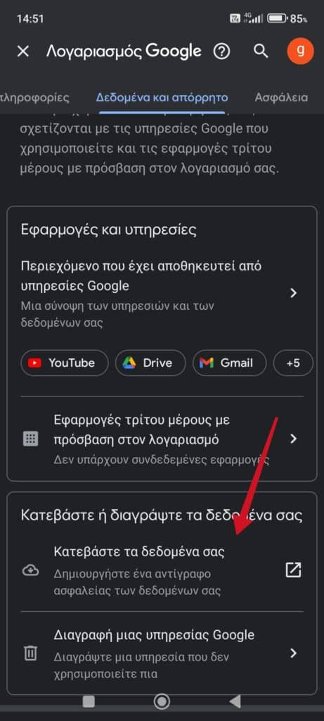 4. Εκεί, κάνε σκρολ προς τα κάτω και πάτα στην επιλογή Κατεβάστε τα δεδομένα σας.