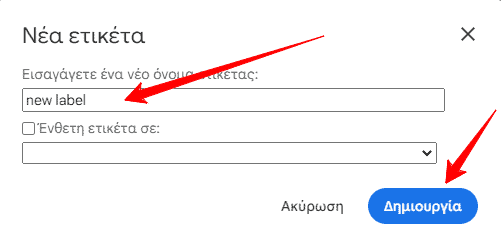3. Τέλος, στο αναδυόμενο παράθυρο, πληκτρολόγησε το όνομα που θέλεις να έχει η ετικέτα σου και μετά απλώς πάτα κάτω δεξιά Δημιουργία! Από εκεί κι έπειτα, μπορείς να επεξεργαστείς τις ετικέτες σου και να προσθέσεις μηνύματα σε αυτές.