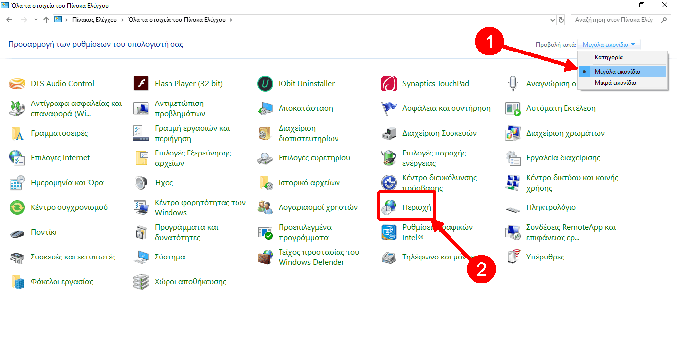 2. Άλλαξε την “Προβολή κατά” από “Κατηγορία” σε “Μεγάλα εικονίδια”. Η επιλογή βρίσκεται επάνω δεξιά στο παράθυρο του Πίνακα Ελέγχου.