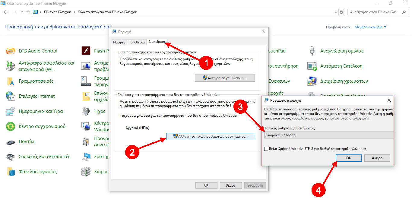 Σημείωση: Για τους χρήστες που χρησιμοποιούν πιο πρόσφατη έκδοση των Windows 10, θα δουν πολύ πιθανόν και μια ακόμα επιλογή, “Beta: Χρήση Unicode UTF-8 για διεθνή υποστήριξη γλώσσας”. Αυτή η επιλογή βρίσκεται ακόμα σε δοκιμαστική έκδοση, αλλά αν το πρόβλημα δεν λυθεί, πάνε πίσω και ενεργοποίησε την.