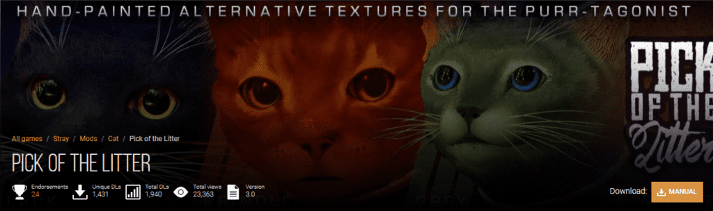 Το Pick of the Litter ουσιαστικά αποτελεί ένα mod, με το οποίο μπορείς να έχεις μία μεγάλη ποικιλία από γάτες με διαφορετικά χρώματα και χαρακτηριστικά.