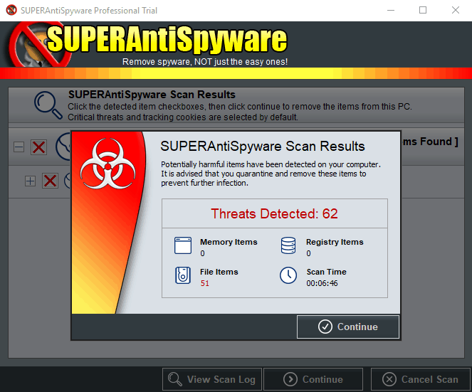 Όπως βλέπεις, από το παραπάνω παράθυρο έχεις την ικανότητα να δεις αναλυτικά τι βρήκε το πρόγραμμα στο σύστημα σου και μπορείς να επιλέξεις αν θέλεις να αφαιρέσεις όλες τις απειλές από το σύστημα σου ή μερικές μόνο. Αν πατήσεις ‘Continue‘, το πρόγραμμα θα αφαιρέσει όλες τις απειλές.