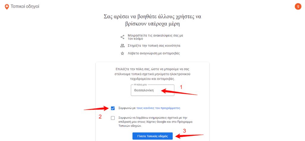 3. Έπειτα, στη νέα οθόνη, θα πρέπει πρώτα να εισαγάγεις την πόλη στην οποία μένεις. Μετά, από αυτό θα πρέπει να τσεκάρεις το κουτάκι για να αποδεχτείς τους όρους και τέλος να πατήσεις κάτω κάτω στο “Γίνετε τοπικός οδηγός”.