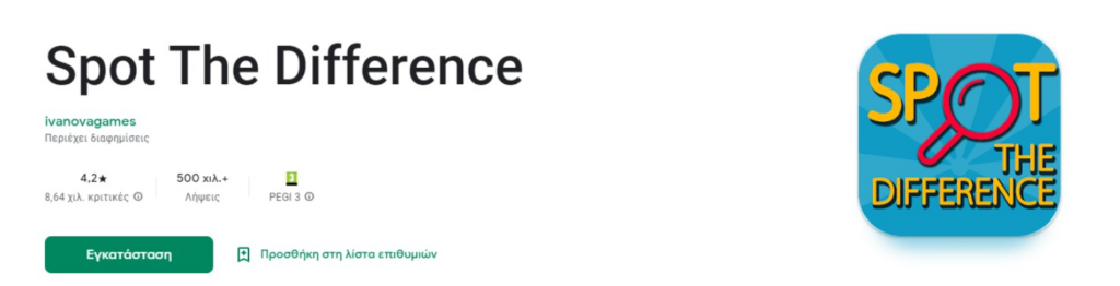 Το τελευταίο παιχνίδι στη λίστα μας είναι το Spot The Difference. Το συγκεκριμένο παιχνίδι ακολουθεί μία πιο απλοϊκή προσέγγιση. Αλλά και πάλι δικαίως ανήκει στη λίστα με τα καλύτερα “Βρες τις διαφορές” παιχνίδια. Υπάρχει η δυνατότητα να κάνεις zoom in και zoom out, ενώ παράλληλα σου δίνει και βοήθειες. Όμως, οι βοήθειες σου στοιχίζουν coins. Τα coins αυτά τα μαζεύεις με την πρόοδό σου στο παιχνίδι, δηλαδή καθώς ολοκληρώνεις κάποια επίπεδα.