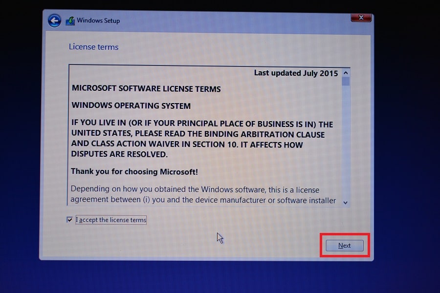Αποδέξου τους όρους για την άδεια χρήσης των Windows 10 και πάτα Accept.