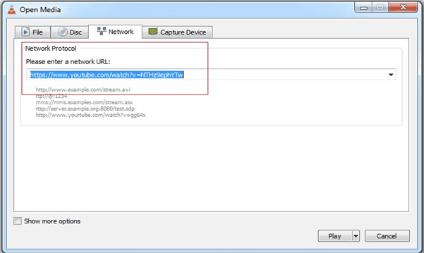2. Τώρα, άνοιξε το VLC Player και πάνε Media -> Open Network Stream, επικόλλησε τον σύνδεσμο μέσα στο πλαίσιο που σου παρέχεται και κάνε κλικ στο κουμπί ‘Play’.